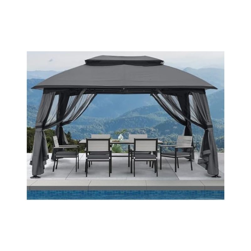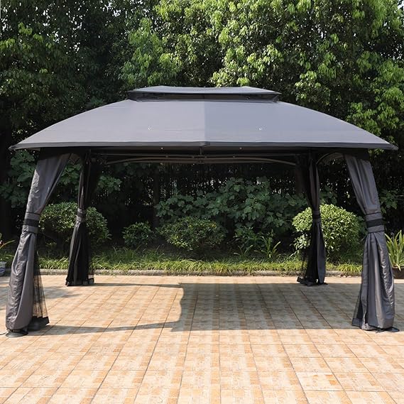 This gazebo’s fabulous design is features arc-shaped steel legs, which are made of high-grade engineered steel and powder-coated for rust-resistance. Each leg’s diameter is Φ80mm ( 3.1” ), stronger and thicker than other frame legs on the market. The open size of our 10’x13’ gazebo is 13′ L x 10′ W x 9′ H, (manual measurement, just for reference!) , which can provide 130 square feet of coverage, affording plenty of room for 6 people at least. Our double vented roof patio gazebo, designed to enhance air circulation and strengthen wind resistance, make you feel relaxed and comfortable. Top cover is made of 500D polyester, all stitching lines are sealed, waterproof, 99% UV protection and fade resistant, with CPAI-84 fire retardant certification. The drain hole at the top is designed to help drain, on rainy days, water won’t collect and crush the frame. Features 4 enclose zippered screen nets and 300D polyester corner curtains. Protect you from the sun and rain as well as flying insects, while still having full airflow and visibility. Velcro straps allowing you to adjust the mosquito nets or corner curtains coverage to fit your needs, beautiful and practical, hope you enjoy the great outdoor time from your private gazebo