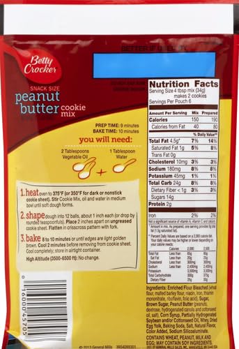 Fill your kitchen with the scent of home-baked cookies in minutes! With Betty Crocker Peanut Butter Cookie Mix, you can treat yourself to oven-fresh peanut butter cookies any time of the day or night. Each 7.2-ounce bag of peanut butter cookie mix makes twelve (12) 2-inch cookies. Prepare cookie mix as is or explore Betty Crocker recipes for a new take on this cookie classic. Don’t forge to use your fork to create the classic peanut butter cookie crisscross. For more than a century, Betty Crocker has been a popular creator of easy, delicious recipes. Today, the Betty Crocker kitchen is still providing convenient, tasty dessert mixes, frostings, and convenient meal options and side dishes. And today, you can still find those same products you grew up with on grocery shelves.
