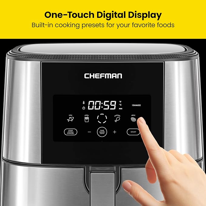 Air frying for the family is so convenient with the Chefman TurboFry® Touch 8-Quart Air Fryer. With effortless one-touch digital controls and four built-in presets, you can cook your favorite foods to the perfect fried finish every time. An adjustable temperature range of 200-400°F gives you complete control, while an automatic shake reminder ensures even cooking. The dishwasher-safe nonstick 8qt basket capacity allows you to feed the whole family, and the stainless-steel exterior wipes down simply with a damp cloth. Purchase includes a 1-year assurance from Chefman. For information on how to use your product, scroll down for a PDF User Guide. 120 Volts/1700 Watts –RJ38-SQSS-8T