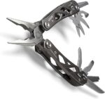 Features needle nose pliers, wire cutters, serrated and plain edge blades knife set, cross driver and flat head small screwdriver set, can opener, bottle opener, trimming scissors, tool lock, and lanyard hole Made from stainless steel with an aluminum handle that will stand the test of time and conveniently travel with you with a tool lock and lanyard hole Easily accessible and fits compactly in a pocket or attached with the included lanyard hole; Butterfly opening and locking feature protects when not in use; Included sheath protects tool when not in use Great for any hunter, tradesman, and the everyday carry consumer; Perfect addition to camping essentials, toolbox, work wear, and fishing and hiking gear