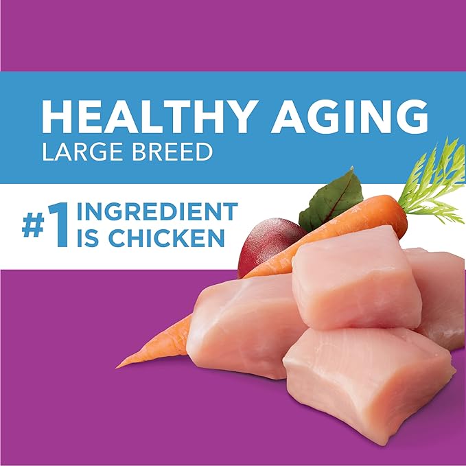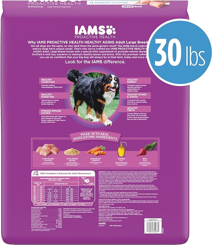Your large breed senior dog is one-of-a-kind… that’s why IAMS makes healthy aging dog food that’s just as unique as they are. IAMS Healthy Aging Adult Large Breed Dry Dog Food with Real Chicken was created to meet the specific wellness and nutritional needs of your older big dog. With real, farm-raised chicken as the first ingredient, this dry dog food is formulated to support healthy bones and joint health in canines with a balance of key nutrients formulated for large breed senior dogs. A blend of fiber and prebiotics promotes healthy digestion. Plus, the tasty dog kibble supports a strong immune system with antioxidants for optimal health. When you feed your mature large dog IAMS dry food, you can feel good knowing they’re getting the nutrition they need to bring out their unique best.