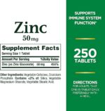 Nature’s Bounty Zinc caplets provide 50mg of Zinc—more than your daily requirement of this essential mineral for immune support and overall health. (1) Along with contributing to immune maintenance, Zinc functions as an antioxidant in the body, involved with collagen synthesis in bone tissue, and assists in the formation of DNA. (1) As a component of the enzyme collagenase, Zinc has also been clinically studied for its contribution to skin health. (1) Nature’s Bounty Zinc combines science, nature and 50 years of expertise and innovation to offer the easiest way to increase your daily intake of this important mineral. For adults, simply take one caplet daily, preferably with a meal. Nature’s Bounty Zinc caplets are gluten free, sugar free, and contain no artificial flavors or sweeteners. And if you’re looking for immune support supplements that are suitable for vegetarians, Nature’s Bounty Zinc is the perfect choice. Each pack contains 250 caplets.