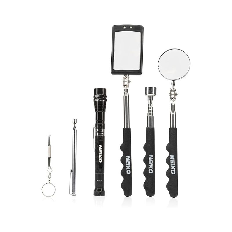 Various Expandable lengths, up to nearly 3 feet! Strong magnet to sweep and be used as a grabber tool or pick up rod. This is the best telescoping mirror tool set for the Bright LED flashlight. Can be conveniently used for hands-free operation to retrieve dropped items behind HVAC, appliances, cabinets, automobile parts, work benches, etc. Our slim foldable and flexible magnetic pickup tool is telescoping and capable of swiveling 360 degrees for those hard-to-reach places. Effortlessly find and retrieve, metal nuts, bolts, screws, nails etc. in hard-to-reach places with this long magnetic pickup tool. Square shaped inspection mirror with light (LEDs), round