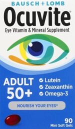 Ocuvite Eye Vitamin Adult 50+ Formula helps replenish essential eye protecting nutrients that you can lose as you age. This eye vitamin and mineral supplement contains antioxidants and nutrients, including Vitamin C, E, and Zinc, to help protect eye health. This Bausch and Lomb’s advanced Ocuvite and Eye Vitamin Adult 50+ solf gels have been specially formulated to help replenish vital eye nutrients that are often not obtained in sufficient quantities through dieting alone. Lutein and Zeaxanthin helps to filter harmful blue light and support macular health. Omega-3 is essential nutrients that are important for proper retinal function. Bausch and Lomb’s Ocuvite Eye Vitamin and Mineral Supplement for Adults 50+ is the doctor recommended 1 per day soft gel to improve eye health. Packaging may vary.