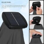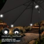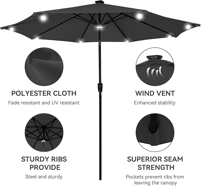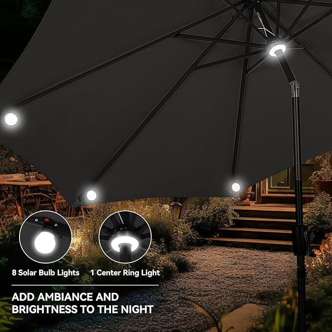 Each rib of this patio umbrella is kitted out with solar-powered LED bulb lights and ring light in the middle. Powered by the top solar panel, these lights have a run time of 8 hours after a full charge. A handy switch on the pole controls the lights. Solar light umbrella have easy tilt operation with push button for more angles, hand-crank lift for easy set-up and take-down. With air vented at the top, cool and can withstand sudden gust.The 9.5ft solar patio umbrella is made of 100% polyester fibre and 200gsm waterproof coating material, high density waterproof and can block 99.9% of UV light. Whether it’s sunny or rainy, the outdoor umbrella is the right choice. 1.5-inch diameter heavy duty pole and 8 durable ribs provide optimal support for the outdoor umbrella. The pole and ribs are powder coated in an antique bronze color for rust resistance, which makes our patio umbrella more durable.