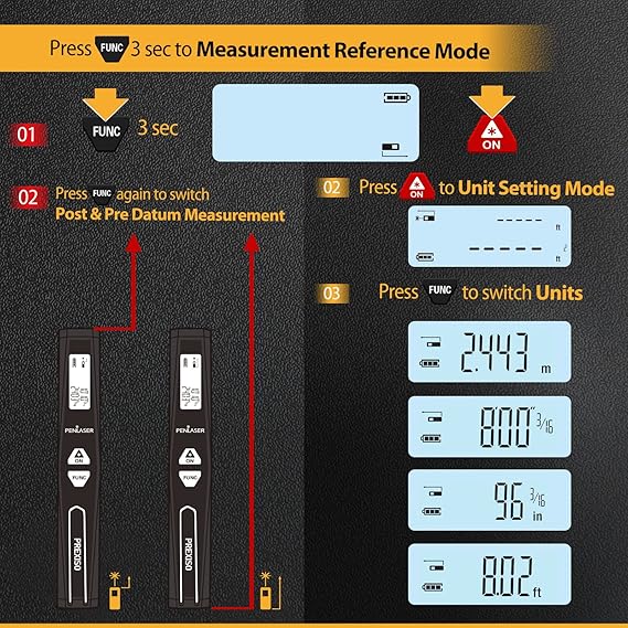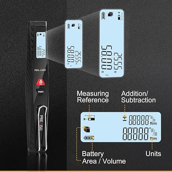 Compact Design: Novel design of imitated carbon fiber shell appearance; 6 inch pocket size laser distance meter with clip for easy carry; Ideal holiday gift for family or friends; Class 2 laser, maximum laser output less than 1mW High Accuracy ASIC Chip: Using ASIC chip that world’s smallest diameter LDM with High Accuracy: ±1/8 inch; Compared with traditional modules, ASIC chip reduces electronic parts by 300 to achieve a smaller size; Measuring range ups to 131 feet to meet your regular measuring need, ideal for home, construction and industries; TIPS: It is recommended to be used indoor 6 Modes Laser Measurement: PREXISO mini laser include: Distance, Continuous, Area, Volume, Pythagorean Method-two Points and Pythagorean Method-three Points meeting you different needs, Calibration, Reference Change and Automatic shutdown without operation for 120s also assures you a easy and quick measurement to improve efficiency