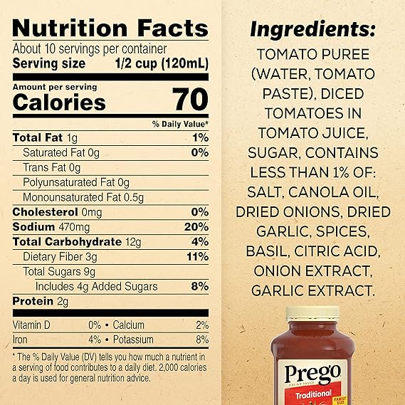 Be the hero at dinner with Prego Traditional Pasta Sauce. Versatile and delicious, this classic red sauce features the rich, sweet taste of vine-ripened tomatoes balanced with flavorful herbs and seasonings, perfect for any recipe. This pasta sauce has a taste everyone loves and a thick texture that doesn’t water out, making it a perfect pairing with any pasta. Prego pasta sauce is gluten free, vegan and made without artificial colors or added MSG for a spaghetti sauce you can feel good about. Top off any pasta with this Prego Italian sauce for a quick, family-pleasing meal, or use it as a base for your favorite recipes. The tomato sauce jar top is easy to close and store in the refrigerator for leftovers. Give your family the taste everyone loves with Prego sauces. In addition to Traditional Pasta Sauce, Prego offers a variety of favorites, including Chunky Tomato, Garlic and Onion Italian, Low FODMAP and more!