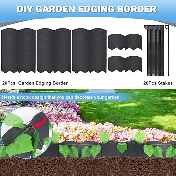 Garden Edging Border can be bent into a circle according to the required diameter,Help you combine it into arcs, ovals, circles, hearts, and other shapes you want. Suitable for decorating lawn borders, flower bed edging, planters, walkways, rock gardens,and more. Easy to install with no digging required Garden edging border is made of brand-new upgraded material. This flower bed border edging design can withstand weather conditions very stable and not easy to break. Heat resistance, no blistering,no deformation, high toughness, can be bent as needed to ensure long-term use The size of each garden edging fence is 12.2 x 5.9 inches, 20 pieces per set, and Total length is 6.2m/20.3ft, Enough to decorate the edges of your lawn and garden plants.You will get 20Pcs landscape edging and 20Pcs landscape edging stakes